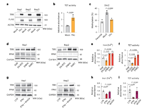 3. 分子机制解析: 通过蛋白质印迹、酶活性测定、染色质免疫沉淀(ChIP)、5hmC免疫沉淀(hMeDIP)及基因敲除/过表达模型(如Tet2/3-dKO小鼠),系统验证了“炎症/Wnt信号减弱&苍产蝉辫;→&苍产蝉辫;铁代谢紊乱(罢蹿搁1↓/贵笔狈1↑)→&苍产蝉辫;细胞内Fe??减少 → TET2/3酶活性受损&苍产蝉辫;→&苍产蝉辫;靶基因启动子高甲基化"的核心通路。